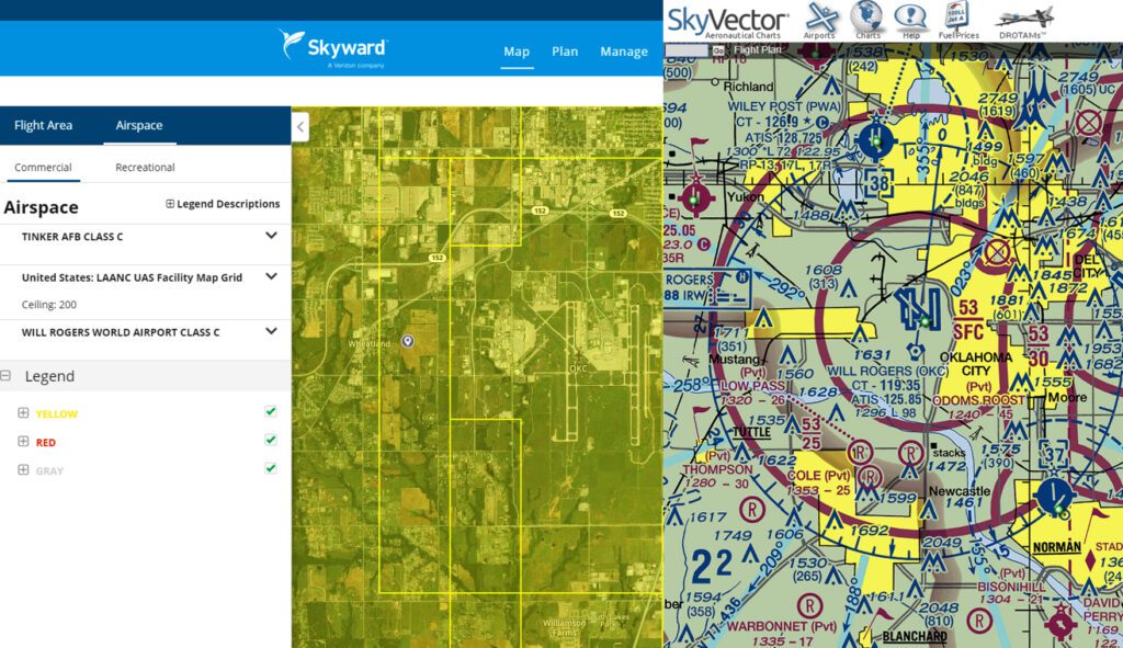 Web-based UAS management platforms (above, left) enable flights to be logged and permission to be requested through Low Altitude Authorization Notification Capability (LAANC) automation. However, they shouldn’t take the place of reviewing sectional aeronautical charts (right) entirely. These maps show Will Rogers World Airport in Oklahoma City.
