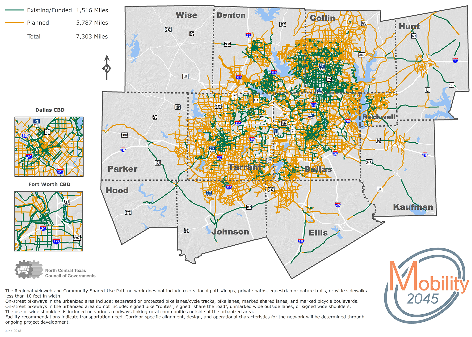 More than 7,300 miles of combined Regional Veloweb trails, community paths and on-street bikeway networks are shown on this NCTCOG map.